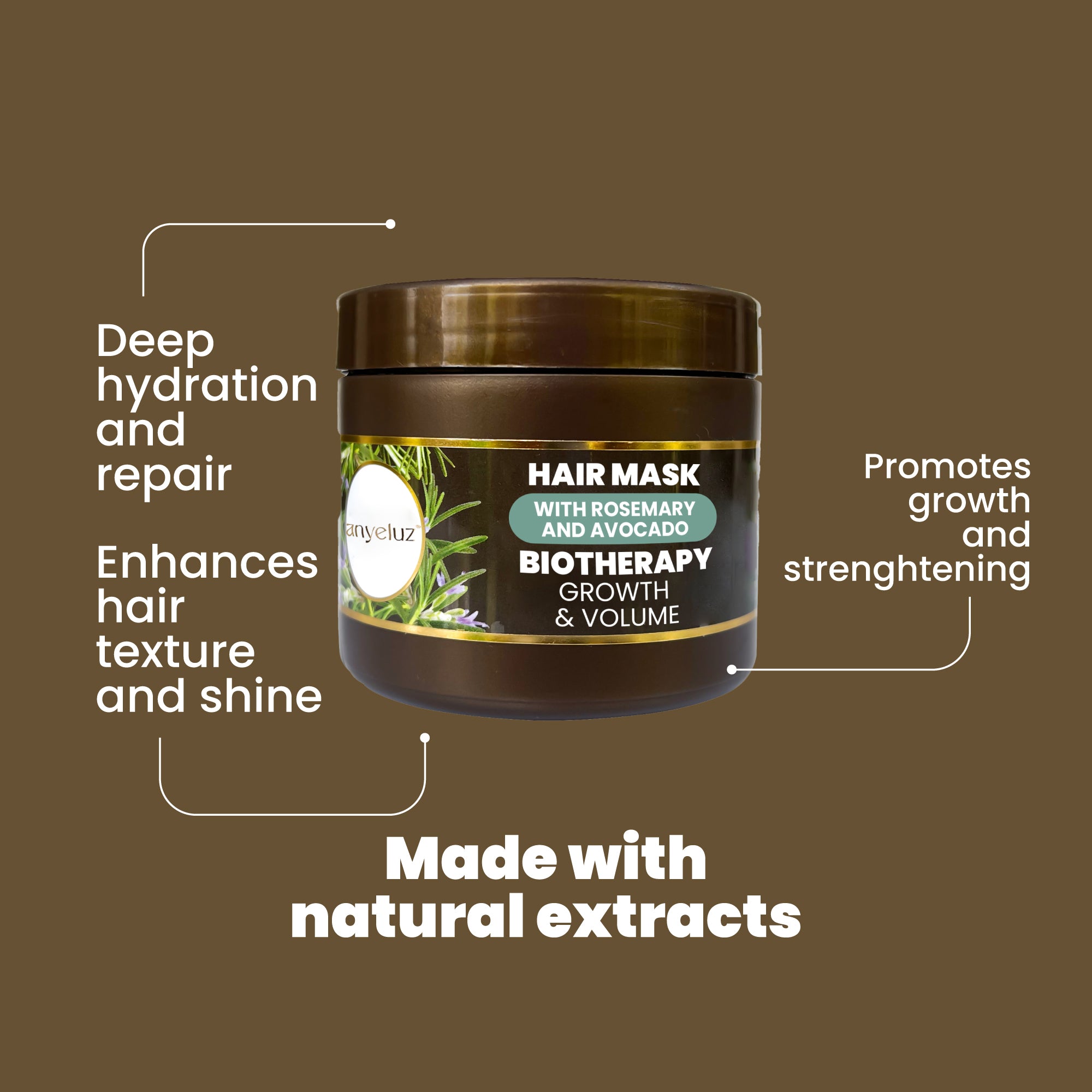 - Night use on all types of hair: Apply from roots to ends and leave on overnight (it doesn't matter if the hair is dirty), the next day wash your hair with any Anyeluz´s Shampoo.