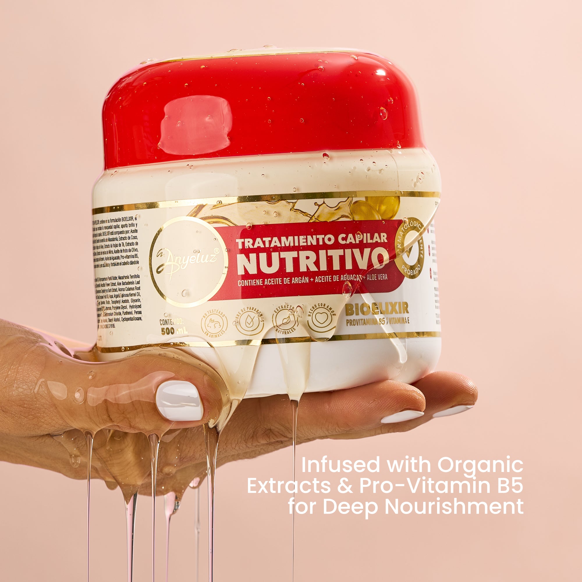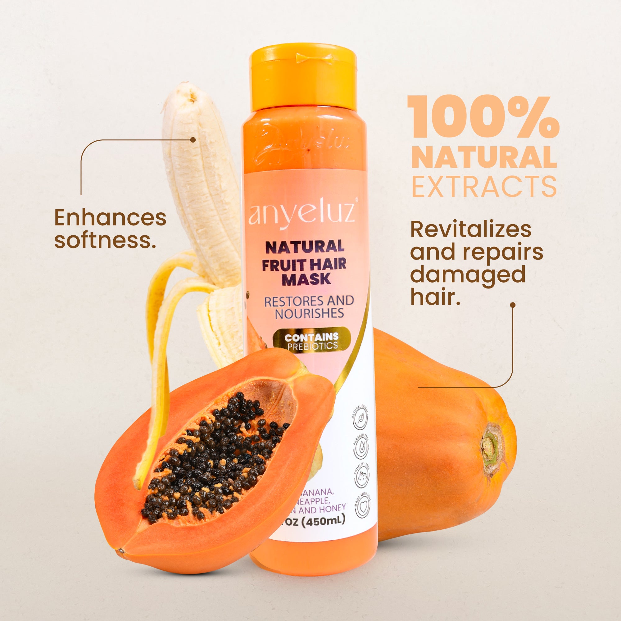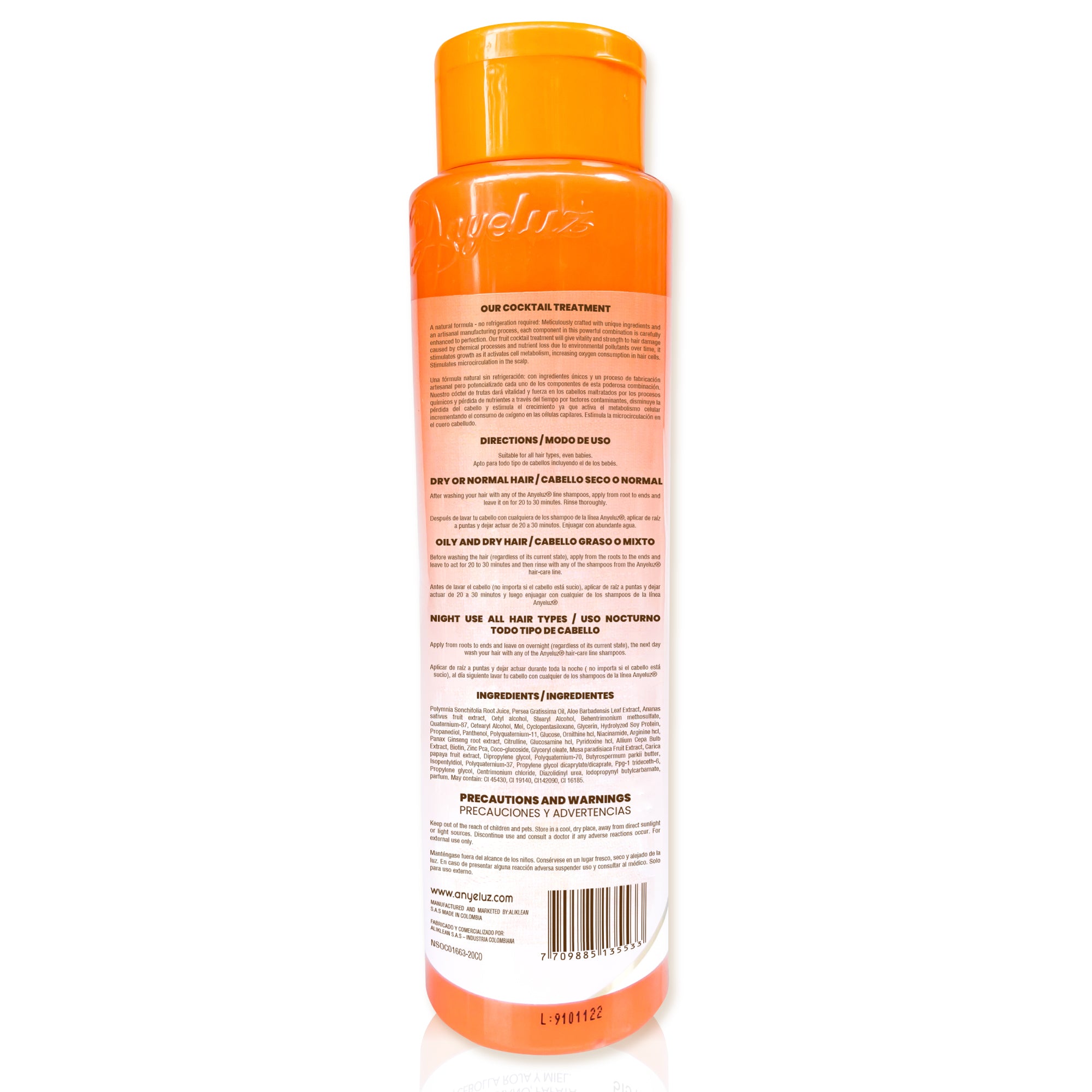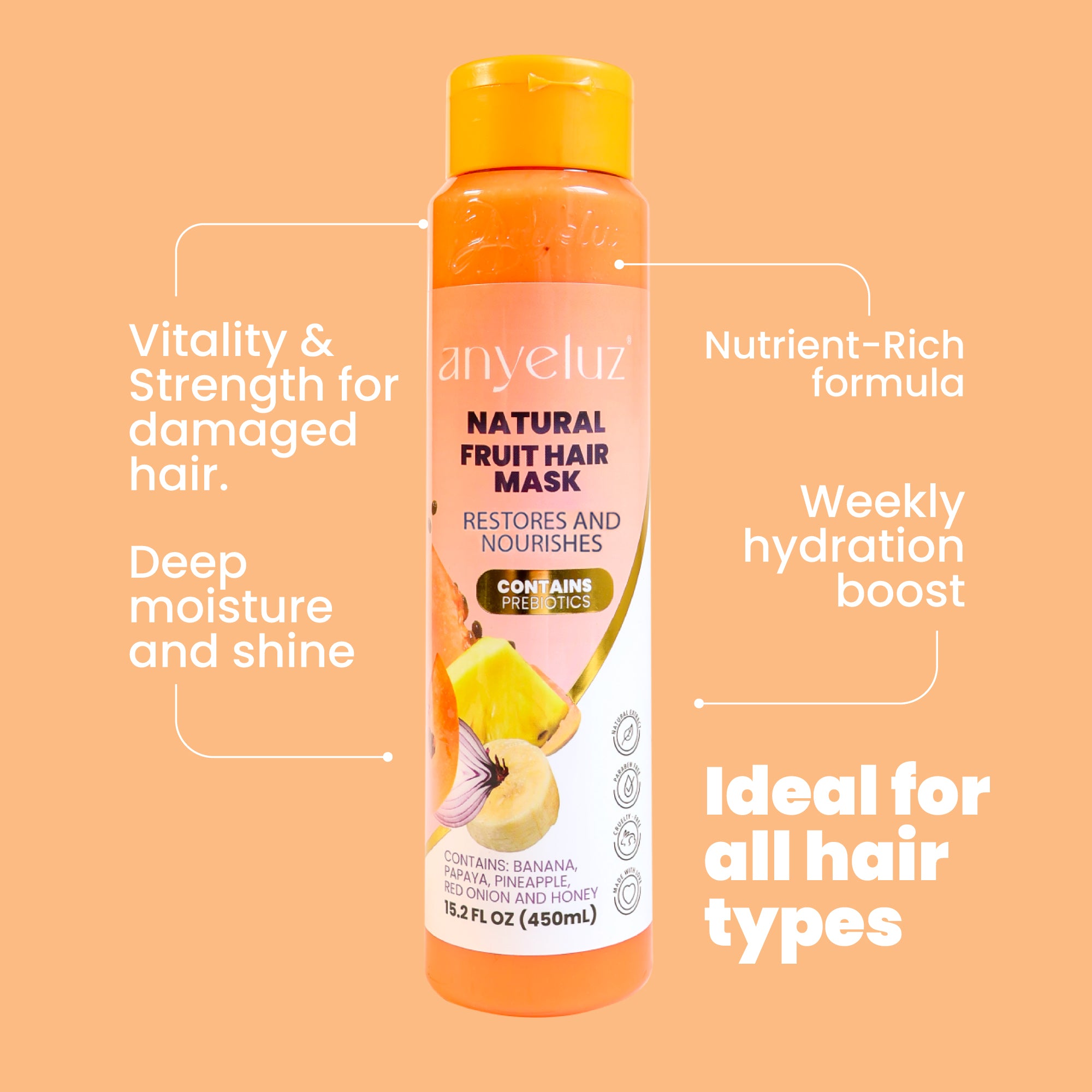 Discover the incredible Anyeluz Natural Fruit Cocktail! Our Hair Treatment with natural formula and unique ingredients is designed to provide vitality and strength to hair damaged by chemical processes and the loss of nutrients over time due to polluting factors. With an artisanal manufacturing process, this rejuvenating treatment is the perfect ally to care for and revitalize your hair.